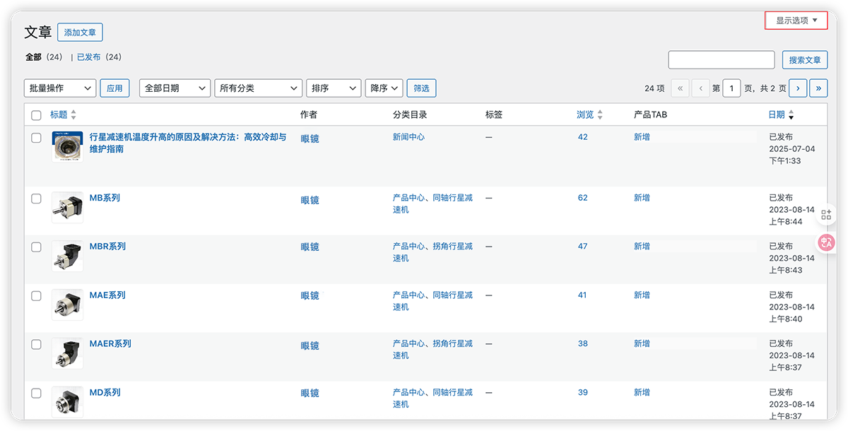 WordPress 后台很多页面右上角,比如后台文章列表页面,都会有「显示选项」和「帮助」这两个按钮,一个是用来显示和设置该页面的选项,一个是用来获取该页面的帮助信息: