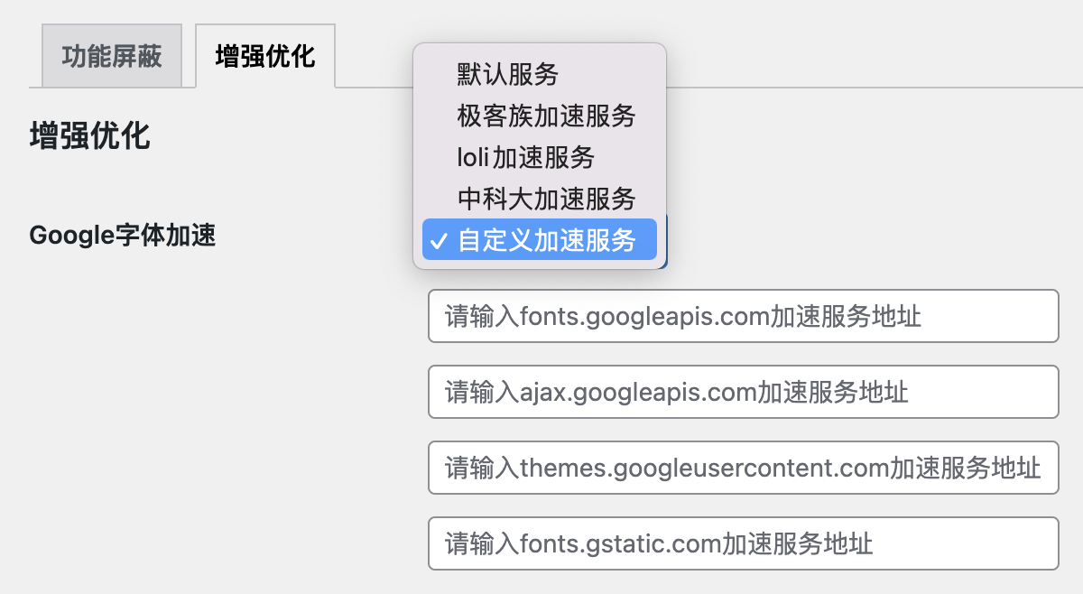WPJAM Basic 可以让选择第三方 Google 字体字体加速服务,也可以自定义输入加速服务地址: