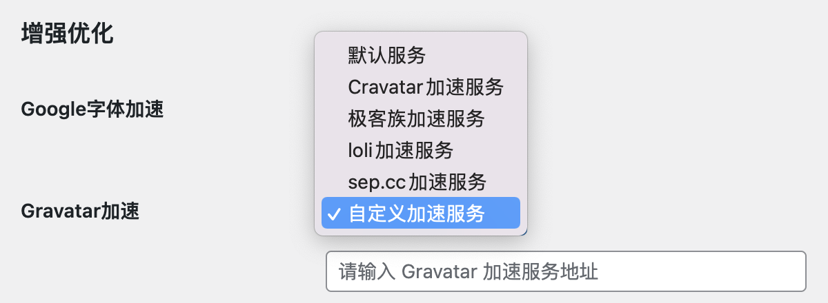 WPJAM Basic 可以让选择第三方 Gravatar 镜像加速服务,也可以自定义输入加速服务地址: