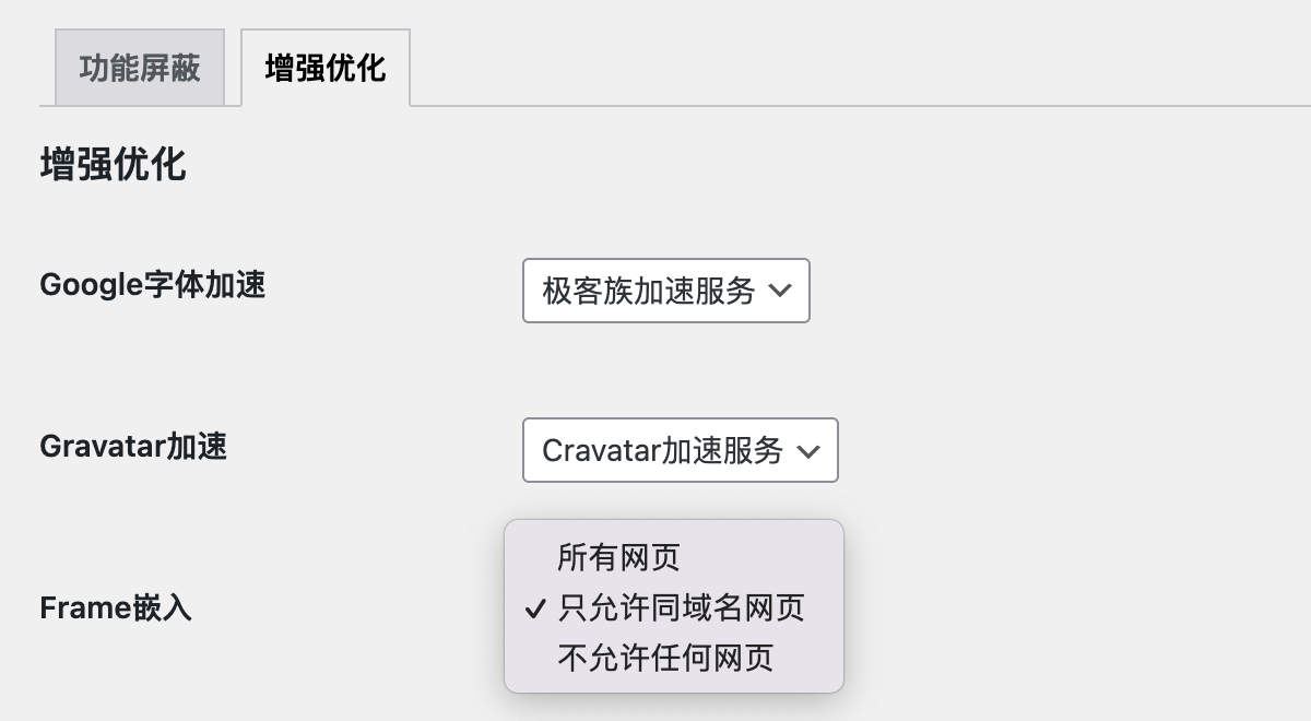 WPJAM Basic 可以让你直接在后台设置 Frame 嵌入,避免点击劫持,增强网站的安全性: