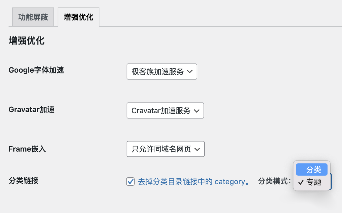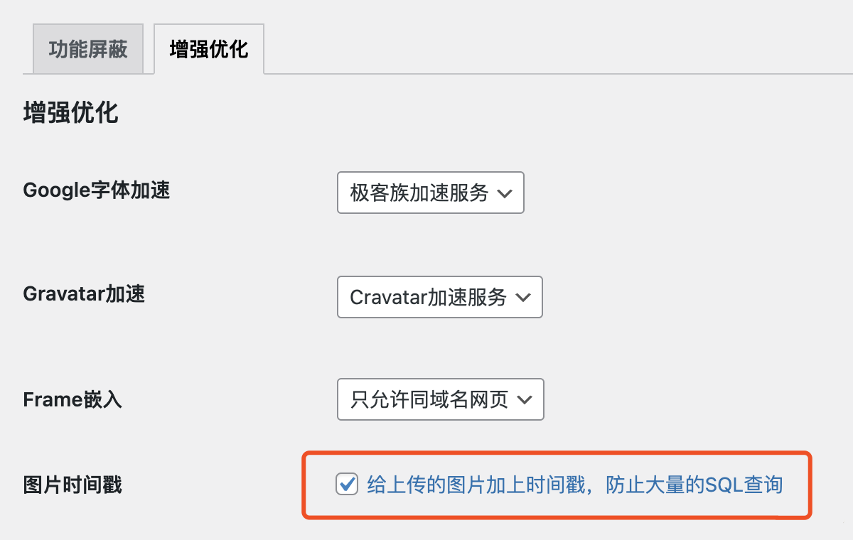 增强优化主要将 WordPress 一些资源加速优化,并且添加一些常用的小功能,目前有以下的功能: